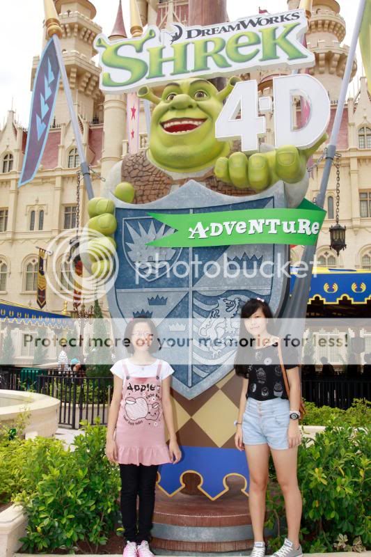Later, we watched a Shrek 4-D Adventure. It's like 3D, gotta wear the glasses but it's more real. There were water and chair movements too. Cool, but got pretty wet after the show. Haha!